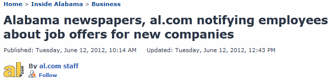 - Mobile Press-Register: Newspapers, al.com notify employees of job status (This from the paper that announced their decreased print schedule with the front-page headline: “Exciting changes for our readers.”)