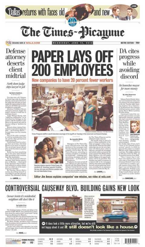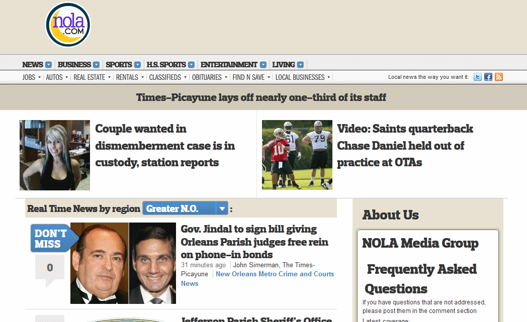 The headline, “Paper lays off 200 employees,” is prominent and gets straight to the point. The story includes large, color pictures from inside the newsroom and a wealth of department-by-department information. NOLA.com featured the headline in a banner in between the site’s navigation and the “front page” story.