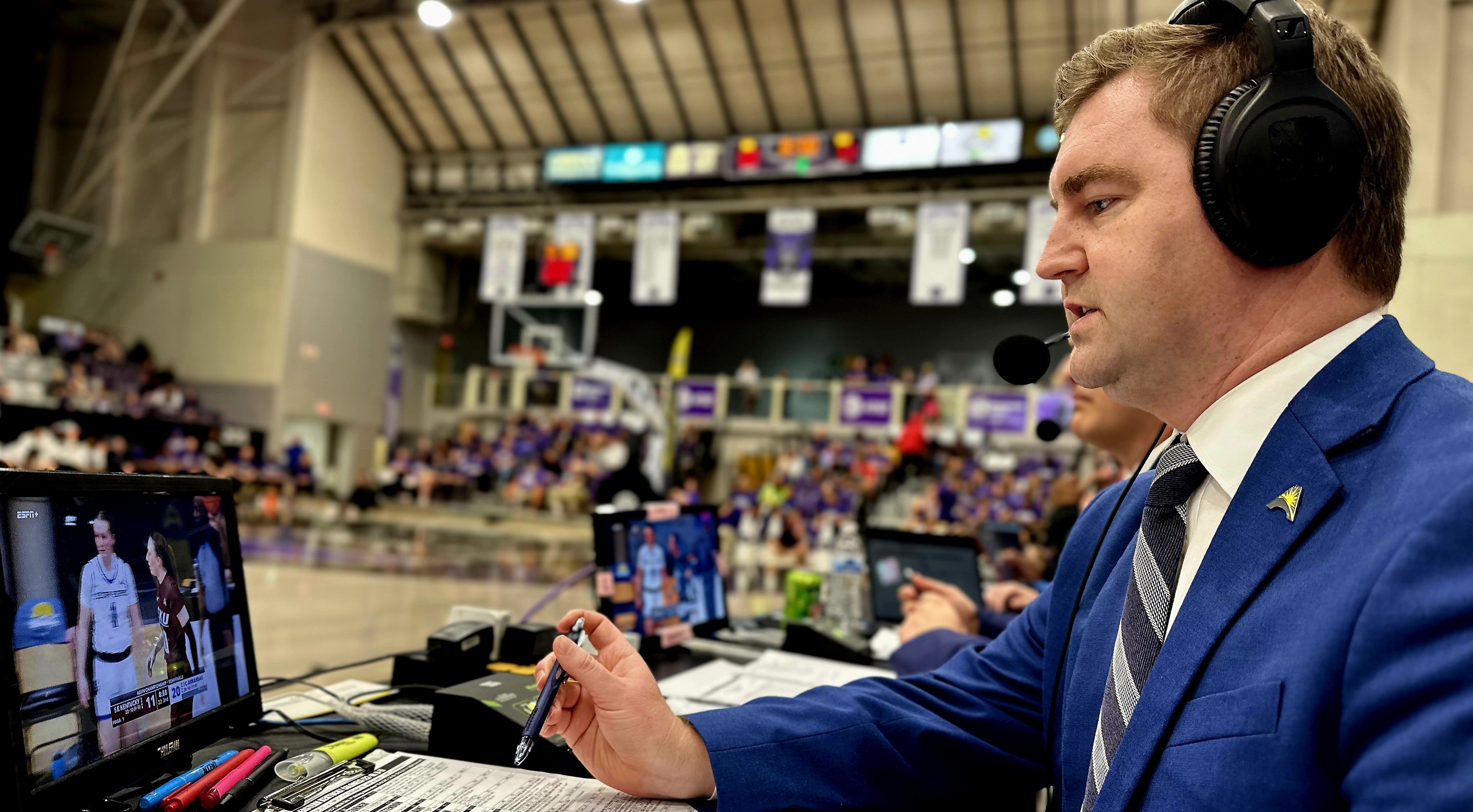 Dylan is a play-by-play announcer for ESPN+, calling football, basketball, baseball, softball, volleyball and soccer. His full-time job as a professor of sports media means he understands the art and science of broadcasting. The hot mic means it’s not mere textbook knowledge.